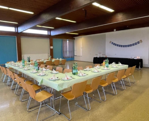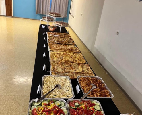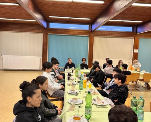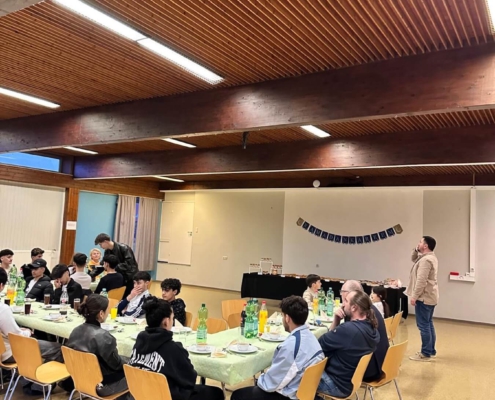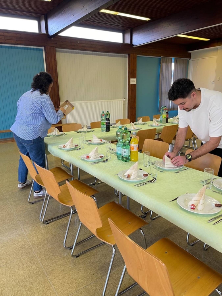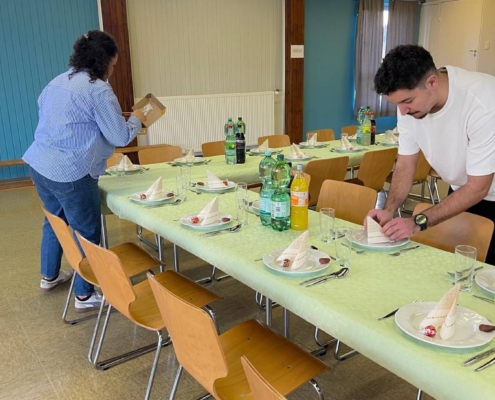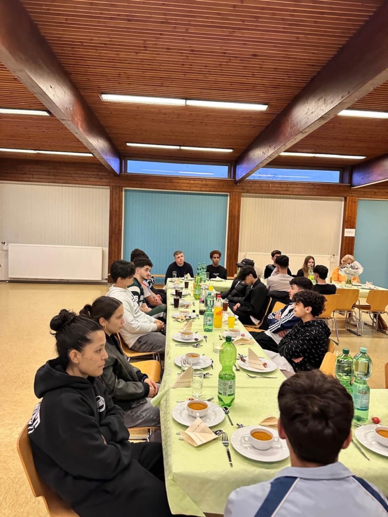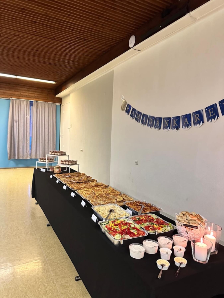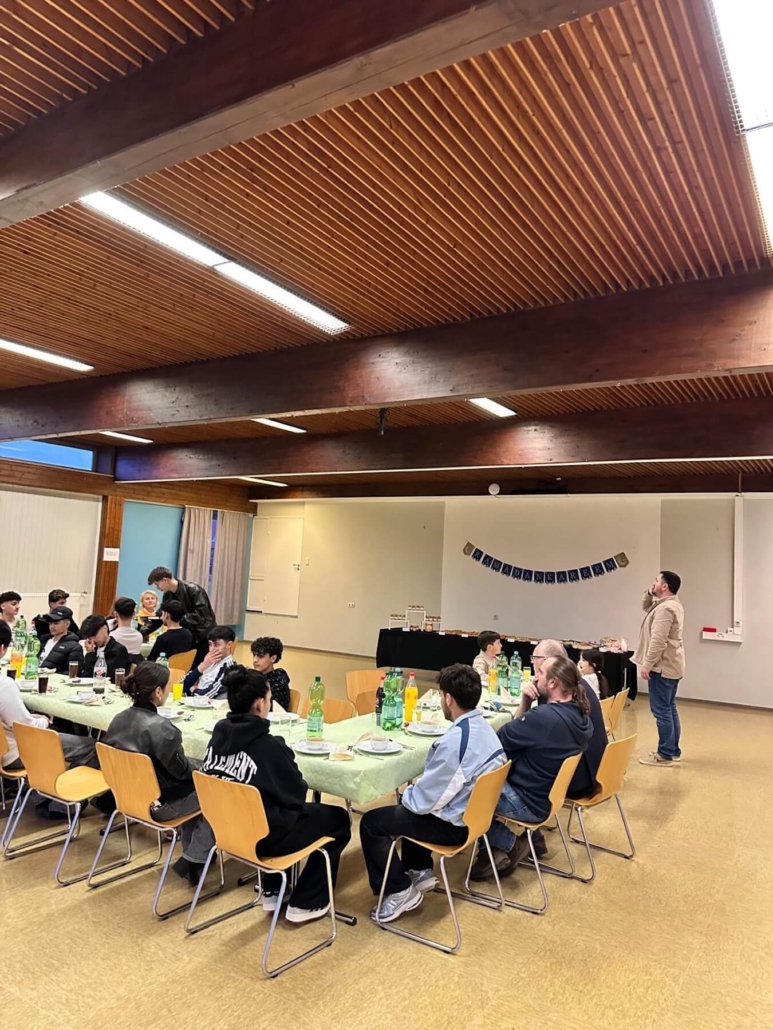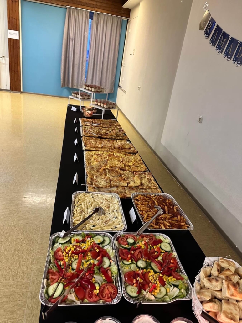 In der Mehrzweckhalle wurde ein leckeres, reichhaltiges Büffet aufgebaut und wir speisten ab 18.24 Uhr, dem Moment des Sonnenuntergans, in großer Runde gemeinsam. Zuvor hatte Kübras Ehemann für uns ein Dua (Bittgebet) für das Fastenbrechen aufgesagt. Schon seit 2016 betreuen wir in unseren stationären Wohngruppen Jugendliche muslimischen Glaubens.